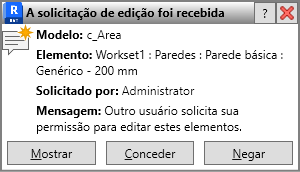 Mensagens de notificação são exibidas por aproximadamente 30 segundos. Após este período, é possível utilizar a caixa de diálogo Solicitações de edição para verificar as solicitações pendentes e executar uma ação em solicitações de membros da equipe.
