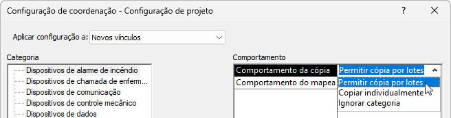 Antes ou ao copiar conexões a partir de um modelo vinculado para um modelo MEP, especifique um comportamento de cópia para cada categoria de conexão na caixa de diálogo Especificar as configurações de coordenação.