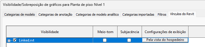 - Na guia Vínculos do Revit, para o modelo vinculado, faça o seguinte: