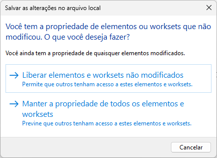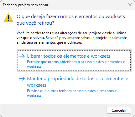 - Clique em Manter a propriedade de todos os elementos e worksets, para manter a propriedade dos elementos que tomou emprestado e dos worksets dos quais tem a propriedade. Você perderá as alterações efetuadas.