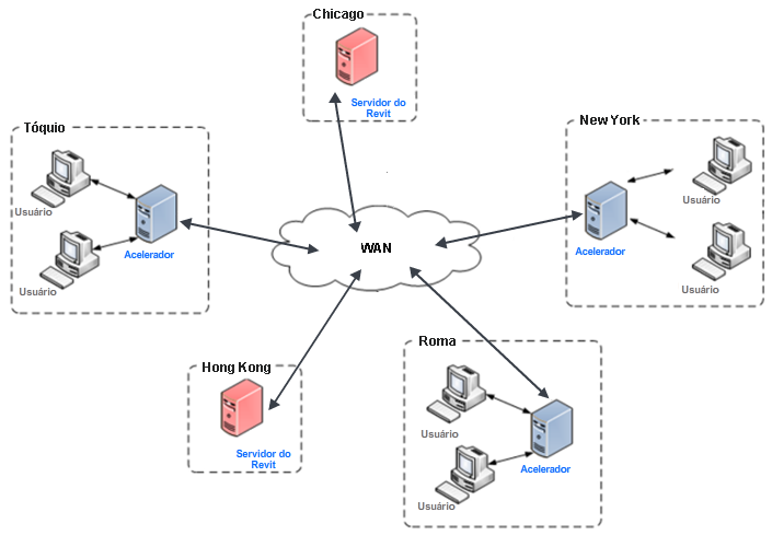 O Revit Server permite o compartilhamento de trabalho com base no servidor, nos quais as equipes de projeto geograficamente dispersas podem colaborar no mesmo modelo através de uma WAN. Como mostrado abaixo, múltipas membros da equipe em múltiplas localizações locais usam os Accelerators do Revit Server para se conectar a um ou mais Revit Servers através de uma WAN.