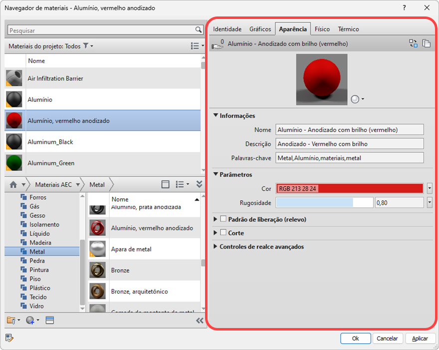 O Revit LT suporta o uso de materiais para definir gráficos de elementos em vistas de projetos e aparências realistas em imagens renderizadas, assim como as informações gerais sobre o material.