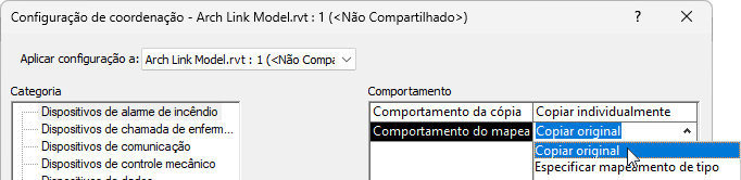 Antes ou ao copiar conexões a partir de um modelo vinculado para um modelo MEP, especifique um comportamento de mapeamento para cada categoria de conexão na caixa de diálogo Especificar as configurações de coordenação.