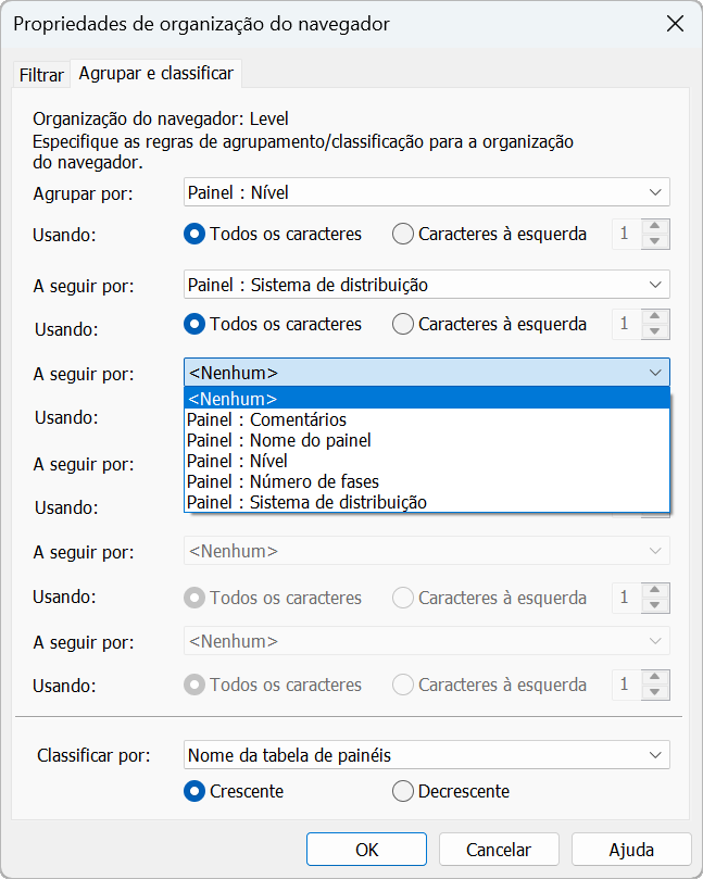 A partir da versão Revit 2026, a Organização do navegador está ativada para Tabelas de painéis. O esquema padrão é definido como Todos.
