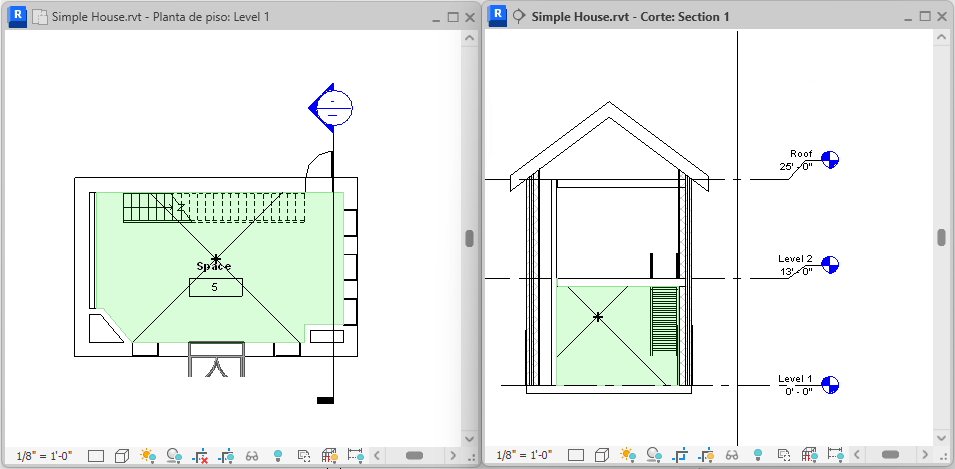 - Feche todas as vistas, exceto a vista de corte e a planta de piso onde deseja colocar o espaço, e digite w t no teclado para colocar as duas vistas lado a lado.