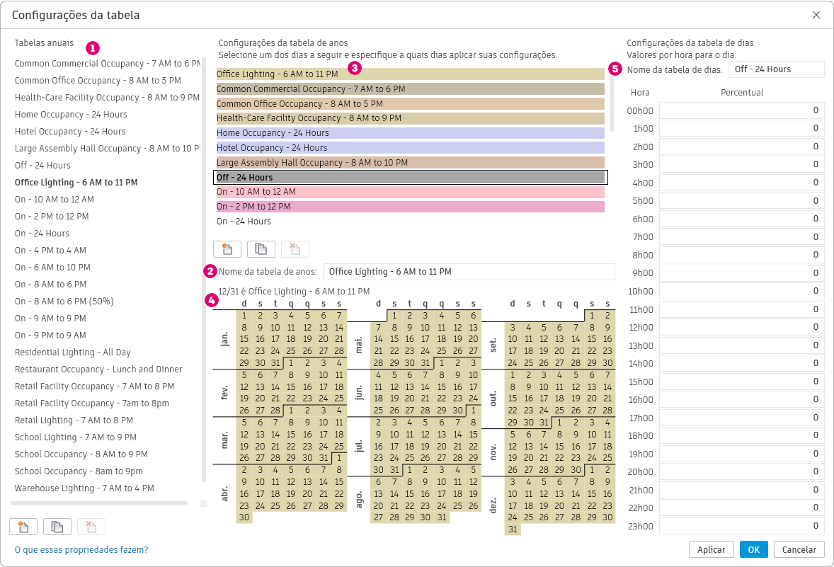 - Na caixa de diálogo Configurações de tipo de construção/espaço, clique no campo de valor para uma tabela (tabela de ocupação, iluminação e potência) e clique em