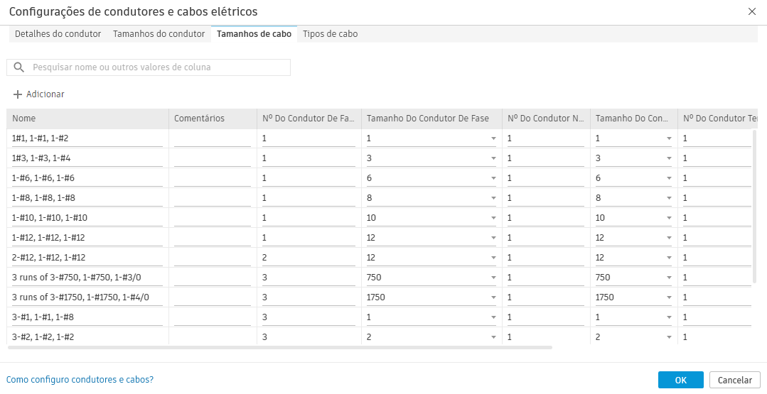 Use essa caixa de diálogo para especificar os parâmetros de fiação e cabo. Use os condutores definidos em circuitos nos projetos elétricos do modelo.