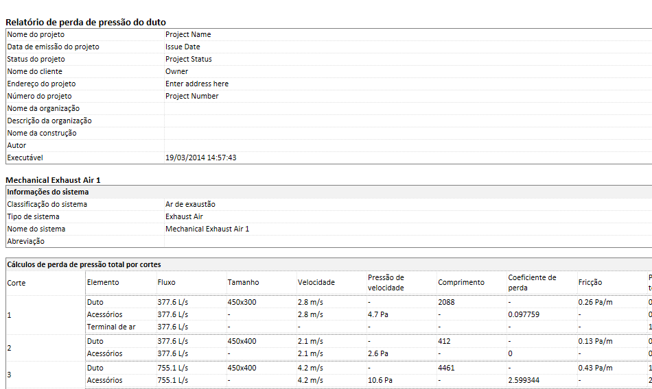 É possível gerar um relatório de perda de pressão para sistemas de duto ou tubulação em seu projeto.