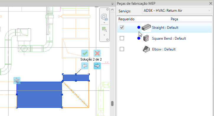 A paleta Peças de fabricação MEP exibe todas as peças utilizadas nas soluções disponíveis. Um ponto azul indica que a peça é utilizada na solução no momento selecionada. Quando você posiciona o ponteiro do mouse sobre uma peça na lista, ela é realçada na área de desenho. Na paleta Peças de fabricação MEP, clique nas caixas de seleção para filtrar a lista das conexões disponíveis e limite o número de soluções.