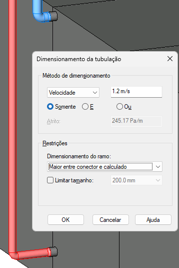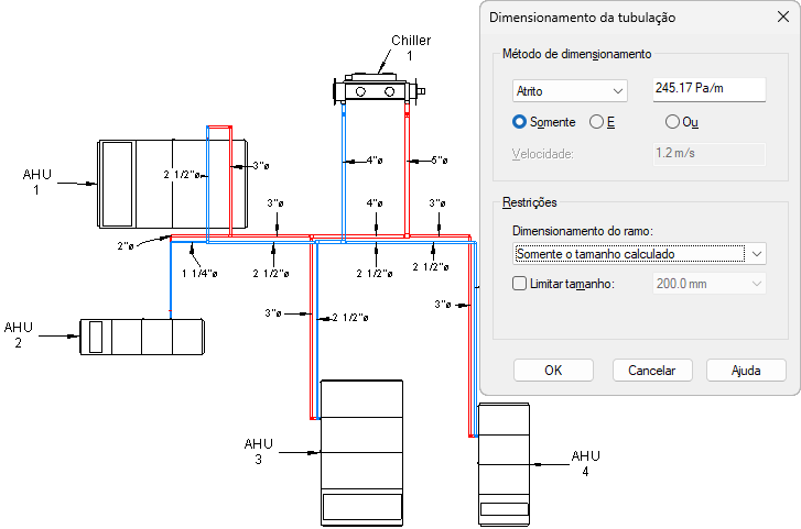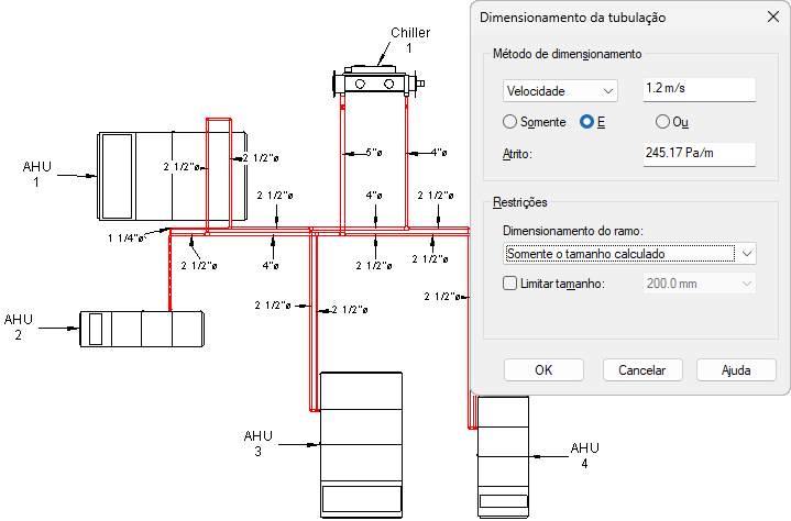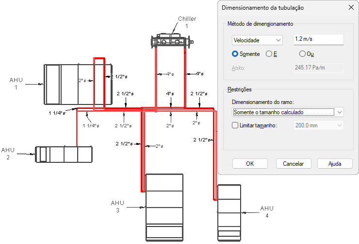 As imagens a seguir mostram os resultados dos diversos métodos de tamanho de tubulação hidrônica.
