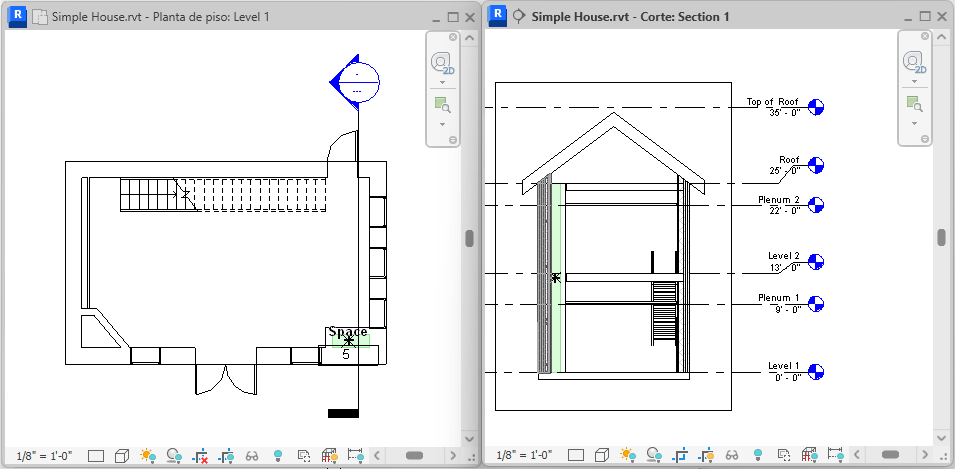 - Feche todas as vistas, exceto a vista de corte e a planta de piso onde deseja colocar o espaço, e digite w t no teclado para colocar as duas vistas lado a lado.