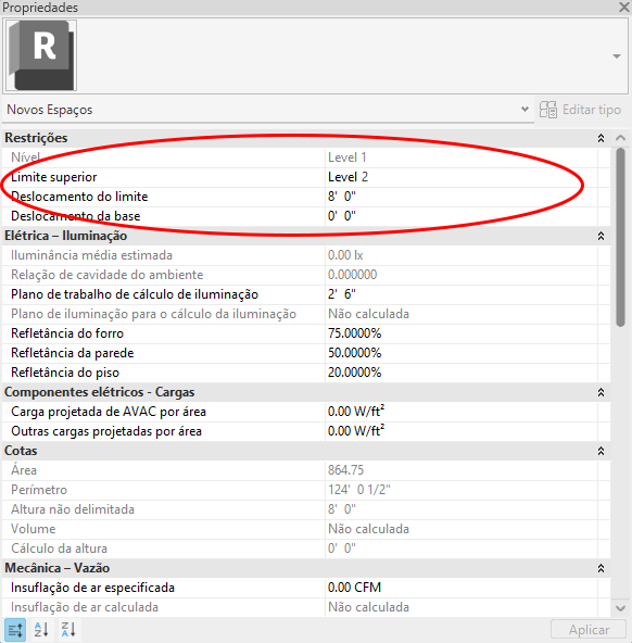 Se a extensão vertical estiver além de um elemento de delimitação de ambiente, como um piso ou teto, o espaço efetuará o snap para o elemento de delimitação de ambiente. No entanto, os controles de arraste e as cotas interativas indicarão a extensão vertical especificada, como mostrado abaixo.