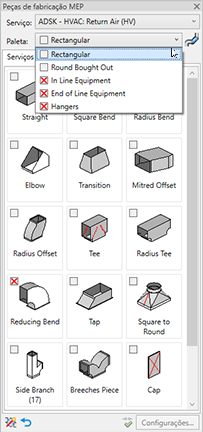 Selecione as peças na paleta Peças de fabricação MEP que não podem ser usadas com as ferramentas de preenchimento automático.