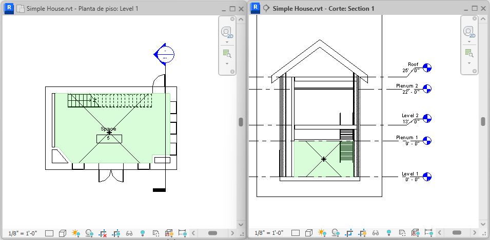 - Feche todas as vistas, exceto a vista de corte e a vista de planta de piso onde deseja colocar o espaço, e digite w t no teclado para colocar as duas vistas lado a lado.