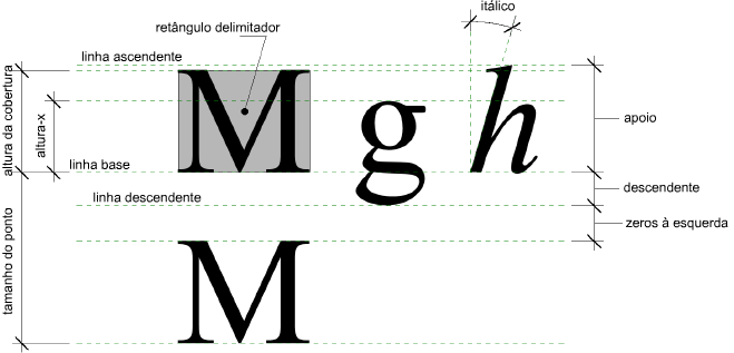 O tamanho do texto agora informa o uso da altura limite, que é medida desde a linha base até a parte superior da letra M maiúscula. É importante observar que muitos caracteres asiáticos são um pouco mais alto do que a letra M maiúscula, portanto, estes caracteres aparecem mais altos do que o valor do parâmetro de tamanho do texto nas fontes ocidentais. Ajuste o parâmetro de tamanho do texto para deixar estes caracteres na altura desejada.