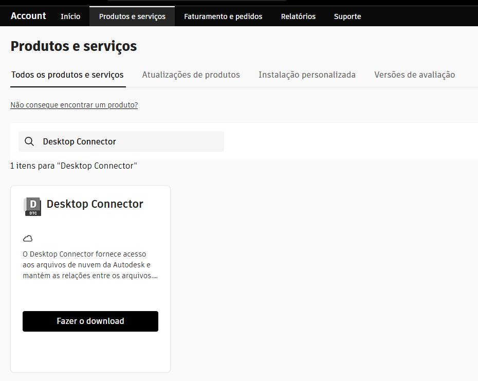 Para fazer o download da versão mais recente, acesse Produtos e serviços da Autodesk Account. O Desktop Connector é exibido em Produtos e serviços.