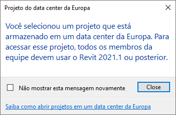 Consulte as informações a seguir se receber um aviso ao acessar um modelo do Revit 2021.1 no Modelador do P&ID que está armazenado em um data center europeu.