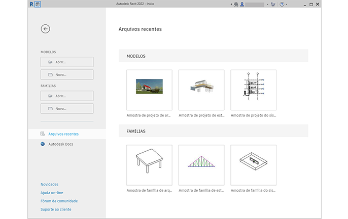 O Início do Revit também exibe um estilo visual modernizado para corresponder ao padrão da Autodesk, com informações otimizadas como links de conteúdo, um botão Atualizar e o acesso ao Autodesk Docs.