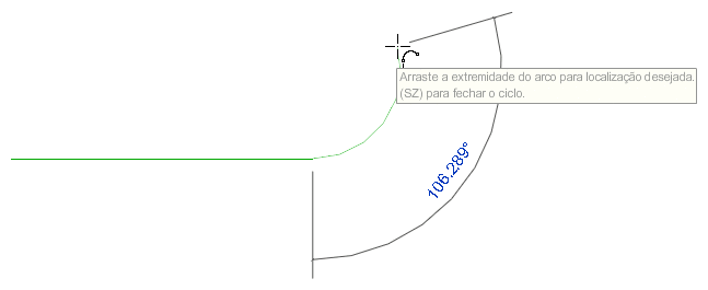 Você definir o raio inicial-final do arco ao desenhar a corda que conecta as duas extremidades do arco, e a seguir especifica o ângulo ou raio com o terceiro ponto.
