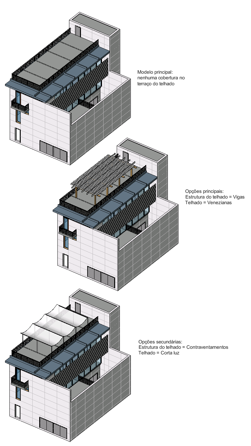 É possível usar opções de projeto para explorar múltiplos desenhos enquanto o projeto se desenvolve. A qualquer momento, no processo de desenho, é possível ter múltiplos conjuntos de opções de projeto. Geralmente, cada conjunto de opções de projeto endereça uma questão particular ou uma área. Por exemplo, para explorar possibilidades para uma pérgula ou um terraço no telhado, é possível criar um conjunto de opções chamado Telhado com múltiplos desenhos de telhado (Para sol ou Poço de ventilação). Além disso, é possível criar um conjunto de opções chamado Estrutura de telhado com múltiplos desenhos estruturais (contraventamentos ou Vigas). Após o desenho final ser escolhido, as opções podem ser incorporadas no modelo principal e as alternativas removidas.