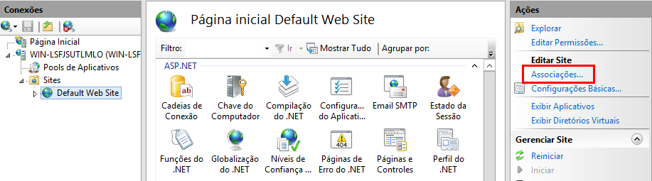 Expanda a árvore de sites e selecione o site que está hospedando o diretório virtual AutodeskDM. Na imagem abaixo, o website é site da Web padrão. Selecione site da Web padrão e clique em Associações no painel Ações.