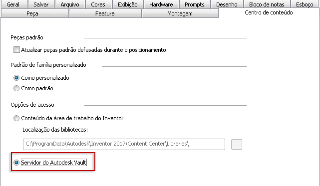 Na caixa de diálogo Opções do aplicativo do Inventor, certifique-se de que o Inventor está configurado para usar o Vault para as bibliotecas do Centro de conteúdo.
