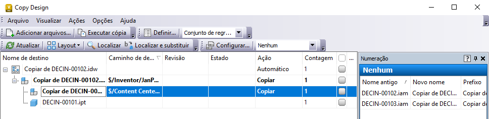 Por exemplo, se um arquivo é marcado para cópia e o desenho associado é marcado como Automático, o desenho recebe o mesmo novo nome de arquivo (com o sufixo (1), (2), (3) etc.) e um local para salvar como arquivo associado quando a operação de cópia é concluída.