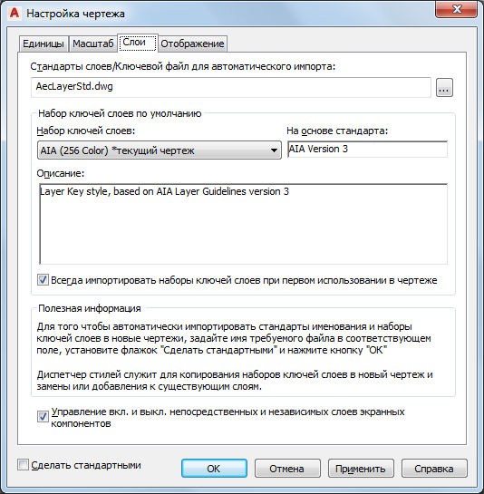 Параметры слоев в диалоговом окне "Настройка чертежа". Обратите внимание, что для стиля ключей слоев задан авто-импорт и что установлен флажок "Сделать стандартными". Такие настройки гарантируют, что даже при начале работы с чертежом без шаблона будет загружаться подходящий набор ключей слоев. Обратите внимание, что флажок опции "Всегда импортировать наборы ключей слоев при использовании в чертеже" также установлен. Этот параметр, основанный на чертеже, должен задаваться в шаблоне. Тем самым гарантируется использование самой последней версии стиля ключей слоев и в тех чертежах, работа над которыми уже ведется.