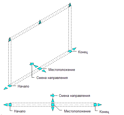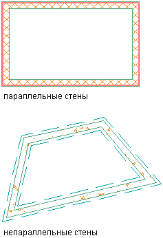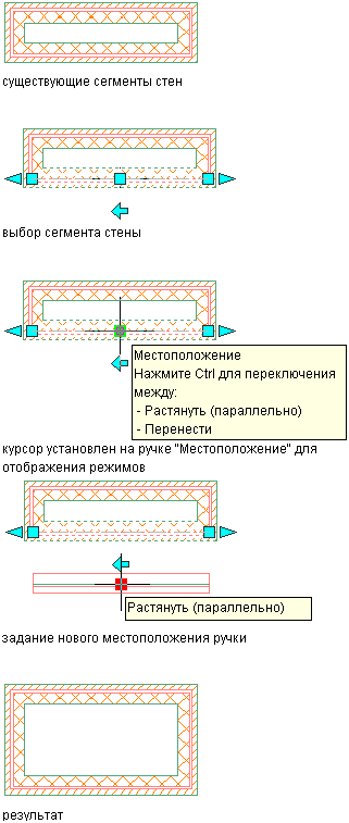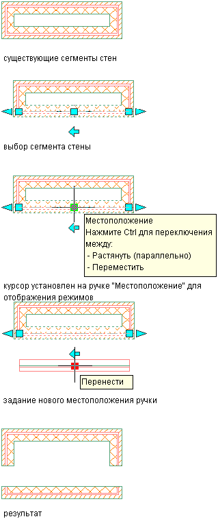 Данная процедура предназначена для изменения местоположения стены с помощью ручки "Местоположение". Существует две ситуации, которые следует иметь в виду при работе с ручкой местоположения: параллельные сегменты стены и непараллельные сегменты стены.