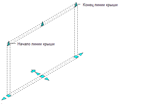 На иллюстрации ниже показаны ручки "Начало линии крыши" и "Конец линии крыши", отображаемые для прямого сегмента стены в 3D и 2D видах.