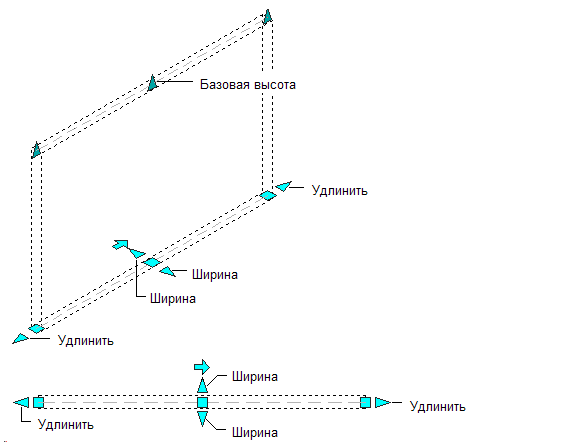 На иллюстрации ниже показаны ручки "Удлинение", "Толщина" и "Базовая высота", отображаемые для прямого сегмента стены в 3D и 2D видах.