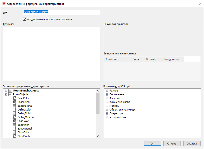 Имена определений характеристик, используемые в этой формуле, отображаются в квадратных скобках, например [Ширина]. Если определение характеристики принадлежит описанию другого набора характеристик, не содержащему данную формулу, то это имя также отображается, например [Объекты-двери:Высота].