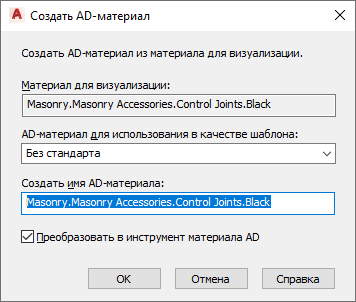 - Если материал визуализации непосредственно перетаскивался на чертеж, будет отображен рабочий лист "Создать AD-материал".