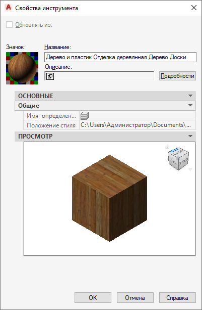 Прим.: Выбранное в качестве шаблона определение материала определит все первичные настройки материала, кроме материала для тонирования. Будут определены слой, цвет, настройки типов линий, штриховка, назначения штриховки поверхности и поведение материала при использовании в разрезе.
