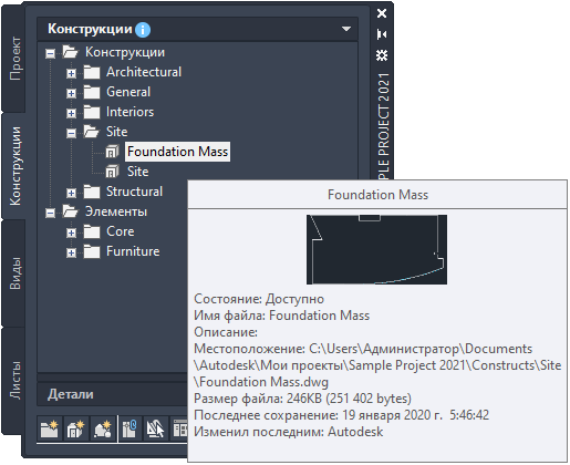 В Диспетчере структуры проекта предусмотрена возможность просмотра миниатюр чертежей проекта. Изображение для предварительного просмотра может представлять собой графический объект, выносной элемент или их комбинацию. Отображение образцов для просмотра удобно при перемещении между компонентами крупномасштабных проектов с большим количеством чертежей.