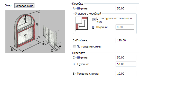 | задать для углов окна структурное остекление | в области "Коробка" установите флажок "Структурное остекление в углу". |