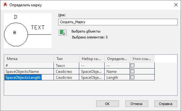 Эта процедура служит для создания марки спецификации, которая захватывает и отображает данные набора характеристик для определенного объекта на чертеже.