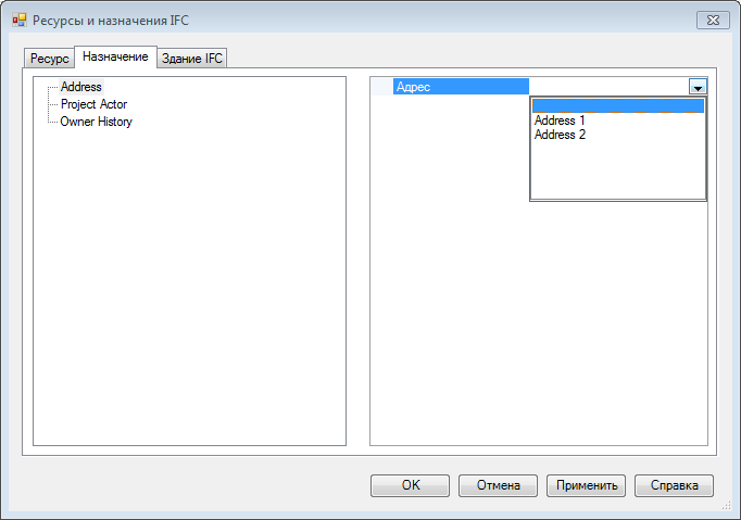 В диалоговом окне "Ресурс и назначение IFC" выберите "Назначение".