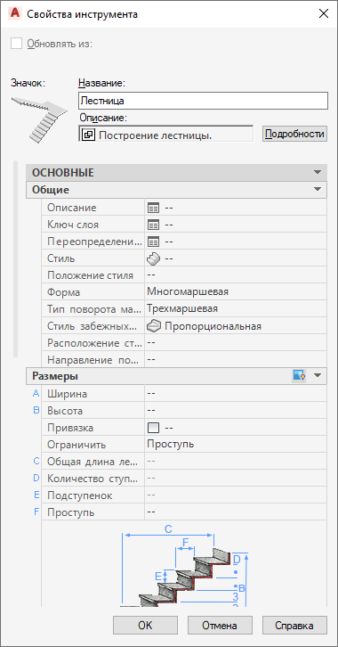 При создании инструмента для стиля лестниц может возникнуть необходимость в задании следующих значений параметров по умолчанию: