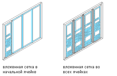 Любая сетка оконной/дверной сборки является одномерной с горизонтальными или вертикальными секциями. С помощью вложенных сеток в оконной/дверной сборке можно создавать различные простые или сложные шаблоны.
