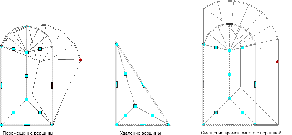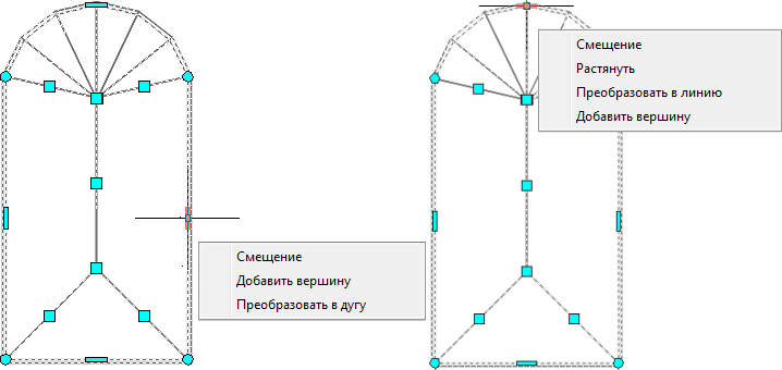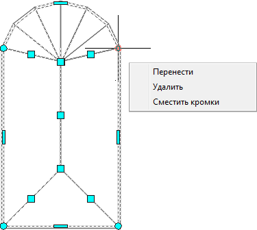 Ручка "Кромка" имеет пять режимов редактирования: "Смещение", "Добавить вершину", "Преобразовать в дугу", "Преобразовать в отрезок" и "Растянуть".