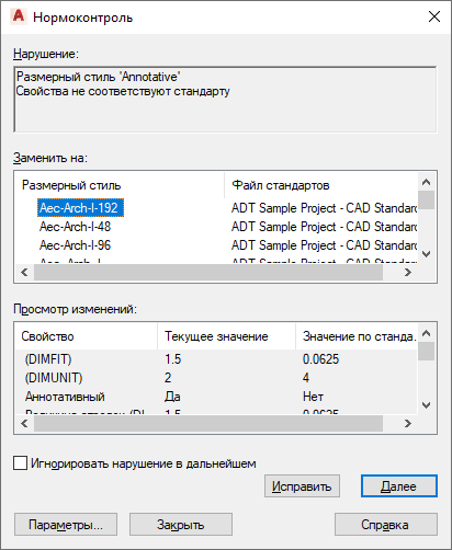 В "Неполадках" представлен первый размерный стиль AutoCAD, текстовый стили или стиль типа линий, несогласованный со стандартами AutoCAD проекта.