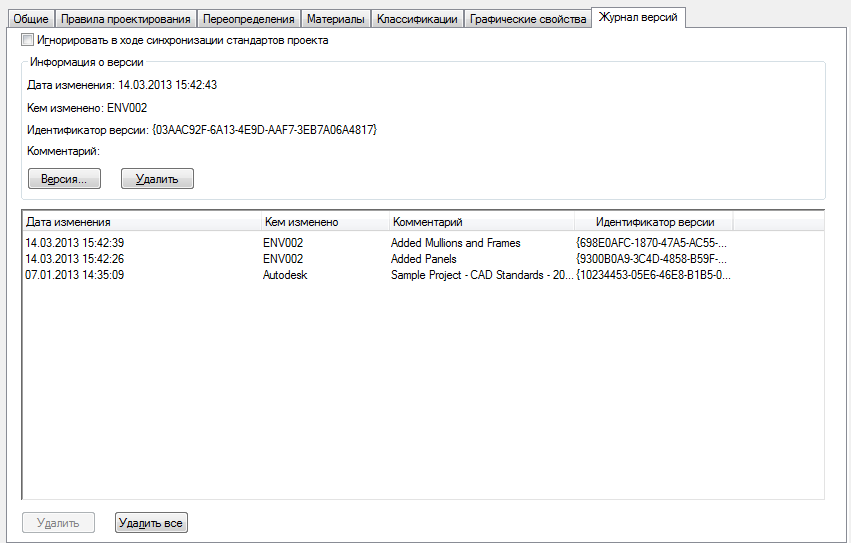 У каждого стиля и графического параметра в составе чертежа стандартов проекта есть своя история версий. В истории версий представлены уникальный идентификатор версии (GUID), дата и время изменения, имя пользователя и любые дополнительные комментарии, введенные пользователями.
