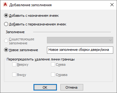 | "Добавить" для "Переопределение ячеек" и требуется вставить дверь или окно со стилем, отличным от существующего в чертеже, и удалить границу каркаса, окружающего объект, | выберите "Новое заполнение" и введите имя для объекта. Затем в опции "Переопределение удаления границы каркаса" выберите "Сверху", "Снизу", "Слева" или "Справа" и нажмите "ОК". |