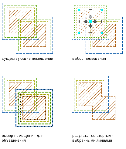 Пример 2: границы пространства 1 смещаются вручную и имеют значение смещения 0,3 между отдельными границами. Границы пространства 2 смещаются по стилю, и стиль определяет смещение между границами в 0,25 м. Если пространство 1 объединяется с пространством 2, свойство "Смещения границ" для полученного пространства приобретает значение "Вручную". Так как граница в чистоте, полезная и общая границы пространства с заданными в стиле смещениями не позволяют редактирования с помощью ручек, объединяются только базовые границы обоих пространств. Границы второго пространства с чертежа удаляются.