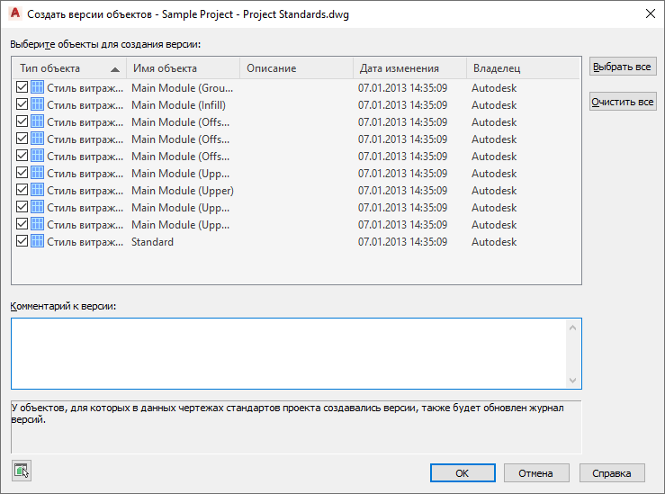Комментарий применяется ко всем выбранным для присвоения версии объектам.