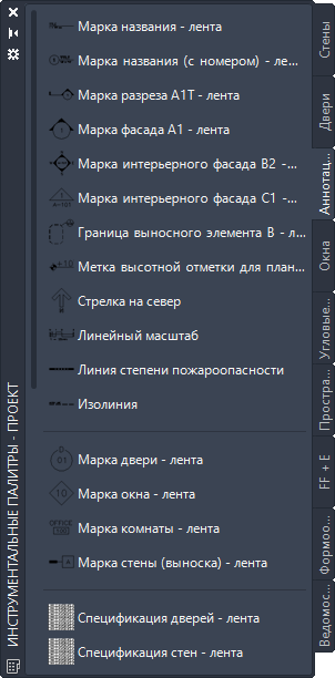 Пользовательские палитры, созданные администратором САПР или другими пользователями, также могут содержать инструменты отметок уровней с определениями многовидовых блоков и свойствами, адаптированными к вашим проектам или стандартам организации.