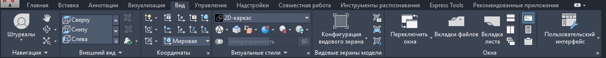 Вкладка "Вид" является основным местом определения и изменения видов и навигации по чертежу.