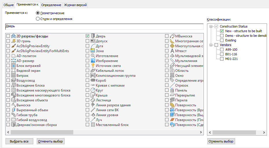 Характеристики, введенные вручную, которые совпадают для всех экземпляров стиля, находятся в определении набора характеристик на основе стиля и применяются к стилю (например стилю стены) или определению (например определению многовидового блока).
