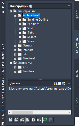 Для каждого проекта здания в инструментарий AutoCAD Architecture 2026 на вкладке «Проект» палитры структуры проекта отображается следующая структура основных категорий: